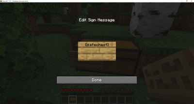 Worried about losing your items during exploration? Fret not! Set up a safe chest where your items will go to upon your death! Be mindful though, if your safe chest is full, then your items will not have space to be stored on subsequent deaths! Setting up a safe chest is simple. Within your claim (important if you do not want others to be able to access it), put down a chest (encouraged to use double chest) and type [safechest] as shown in the image below: